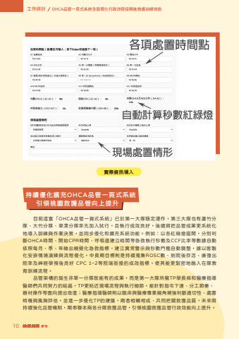 %u76ee%u524d%u9019%u5957%u300cOHCA%u54c1%u7ba1%u4e00%u9801%u5f0f%u7cfb%u7d71%u300d%u5df2%u65bc%u7b2c%u4e00%u5927%u968a%u7a69%u5b9a%u904b%u4f5c%uff0c%u7b2c%u4e09%u5927%u968a%u4e5f%u6709%u8606%u7af9%u5206%u968a%u3001%u5927%u7af9%u5206%u968a%u3001%u8349%u6f2f%u5206%u968a%u7387%u5148%u52a0%u5165%u8a66%u884c%uff0c%u4e14%u57f7%u884c%u6210%u6548%u826f%u597d%uff0c%u5f8c%u7e8c%u5c07%u628a%u54c1%u7ba1%u6210%u679c%u66f4%u7cfb%u7d71%u5316%u5730%u5c0e%u5165%u8a13%u7df4%u8207%u4f5c%u696d%u6c7a%u7b56%uff0c%u4e26%u540c%u6b65%u512a%u5316%u548c%u64f4%u5145%u7cfb%u7d71%u529f%u80fd%u3002%u4f8b%u5982%uff1a%u4ee5%u5404%u7d05%u7da0%u71c8%u5340%u9593%uff0c%u5206%u5225%u5224%u65b7OHCA%u6642%u9593%u3001%u958b%u59cbCPR%u6642%u9593%u3001%u547c%u5438%u9053%u5efa%u7acb%u6642%u9593%u7b49%u6025%u6551%u57f7%u884c%u79d2%u6578%u53caCCF%u6bd4%u7387%u7b49%u6578%u64da%u81ea%u52d5%u4f9d%u7167%u6bcf%u6708%u3001%u5b63%u3001%u5e74%u7e6a%u51fa%u8996%u89ba%u5316%u6025%u6551%u6307%u6a19%uff0c%u5efa%u7acb%u7570%u5e38%u8b66%u793a%u8207%u79d2%u6578%u9580%u6abb%u81ea%u52d5%u8abf%u6574%uff0c%u64da%u4ee5%u5ba2%u88fd%u5316%u5b89%u6392%u60c5%u5883%u6f14%u7df4%u8207%u6d41%u7a0b%u512a%u5316%uff0c%u4e2d%u9577%u671f%u76ee%u6a19%u5247%u662f%u6301%u7e8c%u8490%u96c6ROSC%u6578%u3001%u5230%u9662%u5f8c%u5b58%u6d3b%u3001%u5eb7%u5fa9%u51fa%u9662%u7387%u53ca%u795e%u7d93%u5b78%u9810%u5f8c%u826f%u597d CPC 1%u20132%u7b49%u9662%u7aef%u929c%u63a5%u7684%u6210%u6548%u6307%u6a19%uff0c%u4f7f%u5176%u80fd%u66f4%u7dca%u5bc6%u5730%u878d%u5165%u5728%u968a%u6559%u80b2%u8a13%u7df4%u6d41%u7a0b%u3002 %u54c1%u7ba1%u67b6%u69cb%u7684%u8a95%u751f%u975e%u55ae%u4e00%u5206%u968a%u5c31%u80fd%u6709%u7684%u6210%u679c%uff0c%u800c%u662f%u7b2c%u4e00%u5927%u968a%u6240%u5c6cTP%u5b78%u9577%u59ca%u548c%u91ab%u7642%u6307%u5c0e%u91ab%u5e2b%u5011%u5171%u540c%u52aa%u529b%u7684%u7d50%u6676%uff0cTP%u66f4%u8cbc%u8fd1%u73fe%u5834%u6d41%u7a0b%u8207%u57f7%u884c%u7d30%u7bc0%uff0c%u80fd%u91dd%u5c0d%u6307%u4ee4%u4e0b%u9054%u3001%u5206%u5de5%u7bc0%u594f%u3001%u5668%u6750%u64cd%u4f5c%u7b49%u9762%u5411%u63d0%u51fa%u6539%u9032%uff1b%u91ab%u7642%u6307%u5c0e%u91ab%u5e2b%u5247%u4ee5%u81e8%u5e8a%u8207%u91ab%u7642%u5c08%u696d%u8996%u89d2%u88dc%u5f37%u5224%u65b7%u9069%u5207%u6027%u3001%u8655%u7f6e%u6642%u6a5f%u8207%u98a8%u96aa%u8a55%u4f30%uff0c%u4e26%u9032%u4e00%u6b65%u512a%u5316TP%u7684%u5efa%u8b70%uff0c%u5169%u8005%u76f8%u8f14%u76f8%u6210%u3001%u5171%u540c%u628a%u95dc%u6551%u8b77%u54c1%u8cea%uff0c%u672a%u4f86%u5c07%u6301%u7e8c%u5f37%u5316%u54c1%u7ba1%u6a5f%u5236%uff0c%u671f%u4e32%u806f%u672c%u5c40%u5404%u5206%u968a%u6551%u8b77%u54c1%u7ba1%uff0c%u5f15%u9818%u6843%u5712%u6551%u8b77%u54c1%u7ba1%u884c%u653f%u6548%u80fd%u5411%u4e0a%u63d0%u5347%u3002%u6301%u7e8c%u512a%u5316%u64f4%u5145OHCA%u54c1%u7ba1%u4e00%u9801%u5f0f%u7cfb%u7d71%u5f15%u9818%u6843%u5712%u6551%u8b77%u54c1%u7ba1%u5411%u4e0a%u63d0%u5347%u5de5%u4f5c%u7814%u8a0e OHCA%u54c1%u7ba1%u4e00%u9801%u5f0f%u7cfb%u7d71%u5168%u9762%u7c21%u5316%u884c%u653f%u6d41%u7a0b%u4fc3%u7cbe%u9032%u6551%u8b77%u8a13%u7df4%u6548%u80fd%u5be6%u969b%u8cc7%u8a0a%u586b%u5165 10