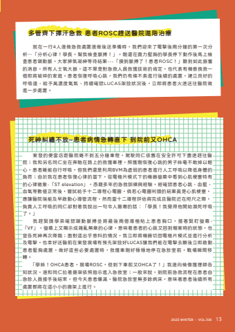 %u5c31%u5728%u4e00%u884c4%u4eba%u908a%u505a%u6025%u6551%u8655%u7f6e%u908a%u505a%u5f8c%u9001%u6e96%u5099%u6642%uff0c%u6211%u5011%u8fce%u4f86%u4e86%u96fb%u64ca%u5f8c%u5169%u5206%u9418%u7684%u7b2c%u4e00%u6b21%u5206%u6790%u2026%u300c%u5206%u6790%u5fc3%u5f8b%uff01%u5b78%u9577%uff0c%u5e6b%u6211%u6aa2%u67e5%u8108%u640f%uff01%u300d%uff0c%u525b%u9084%u5728%u8ce3%u529b%u58d3%u80f8%u7684%u5b78%u9577%u505c%u4e0b%u52d5%u4f5c%u5f8c%u99ac%u4e0a%u6aa2%u67e5%u60a3%u8005%u9838%u52d5%u8108%uff0c%u5927%u5bb6%u5c4f%u6c23%u51dd%u795e%u7b49%u5f85%u7d50%u679c---%u300c%u6478%u5230%u8108%u640f%u4e86%uff01%u60a3%u8005ROSC%uff01%u300d%u807d%u5230%u5982%u6b64%u632f%u596e%u7684%u6d88%u606f%uff0c%u6240%u6709%u4eba%u58eb%u6c23%u5927%u632f%uff0c%u9019%u4e0d%u55ae%u662f%u5c0d%u6025%u6551%u4eba%u54e1%u6551%u8b77%u6280%u8853%u7684%u80af%u5b9a%uff0c%u4e5f%u4ee3%u8868%u6709%u6a5f%u6703%u633d%u6551%u4e00%u500b%u5373%u5c07%u7834%u788e%u7684%u5bb6%u5ead%u3002%u60a3%u8005%u6062%u5fa9%u547c%u5438%u5fc3%u8df3%uff0c%u6211%u5011%u4ecd%u6709%u689d%u4e0d%u7d0a%u9032%u884c%u5f8c%u7e8c%u7684%u8655%u7f6e%uff0c%u5efa%u7acb%u826f%u597d%u7684%u547c%u5438%u9053%u3001%u7d66%u4e88%u9ad8%u6fc3%u5ea6%u6c27%u6c23%u3001%u6301%u7e8c%u78ba%u8a8dLUCAS%u67b6%u8a2d%u72c0%u6cc1%u5f8c%uff0c%u7acb%u5373%u5c07%u60a3%u8005%u706b%u901f%u9001%u5f80%u91ab%u9662%u505a%u9032%u4e00%u6b65%u8655%u7f6e%u3002%u591a%u7ba1%u9f4a%u4e0b%u63ee%u6c57%u6025%u6551 %u60a3%u8005ROSC%u8d95%u9001%u91ab%u9662%u9032%u968e%u6cbb%u7642%u6b7b%u795e%u7cfe%u7e8f%u4e0d%u653e~%u60a3%u8005%u75c5%u60c5%u6025%u8f49%u76f4%u4e0b %u5230%u9662%u524d%u53c8OHCA%u6848%u767c%u7684%u4fbf%u7576%u5e97%u8ddd%u91ab%u9662%u96d6%u4e0d%u5230%u4e94%u5206%u9418%u8eca%u7a0b%uff0c%u99d5%u99db%u540c%u4ec1%u4f9d%u820a%u5728%u5b89%u5168%u8a31%u53ef%u4e0b%u76e1%u901f%u8d95%u5f80%u91ab%u9662%uff1b%u6211%u548c%u53e6%u540d%u540c%u4ec1%u5750%u5728%u5954%u99b3%u5728%u8def%u4e0a%u7684%u6551%u8b77%u8eca%u88e1%uff0c%u7167%u8b77%u525b%u6062%u5fa9%u5fc3%u8df3%u7684%u7537%u5b50%u7d72%u6beb%u4e0d%u6562%u6389%u4ee5%u8f15%u5fc3%uff0c%u60a3%u8005%u96d6%u80fd%u81ea%u884c%u547c%u5438%uff0c%u4f46%u6211%u5011%u9084%u662f%u5229%u7528BVM%u70ba%u865b%u5f31%u7684%u60a3%u8005%u9032%u884c%u4eba%u5de5%u547c%u5438%u4ee5%u964d%u4f4e%u8eab%u9ad4%u7684%u8ca0%u8377%uff1b%u7531%u65bc%u6211%u5728%u60a3%u8005%u6062%u5fa9%u5fc3%u5f8b%u7684%u7576%u4e0b%uff0c%u5f9e%u96fb%u6975%u7247%u6a21%u5f0f%u4e0b%u7684%u6a5f%u5668%u87a2%u5e55%u4e2d%u770b%u5230%u5fc3%u808c%u6897%u585e%u7279%u6709%u7684%u5fc3%u5f8b%u5fb5%u8c61-%u300cST elevation%u300d%uff0c%u6191%u85c9%u591a%u5e74%u7684%u6025%u6551%u8a13%u7df4%u8207%u7d93%u9a57%uff0c%u7d93%u78ba%u8a8d%u60a3%u8005%u5fc3%u8df3%u3001%u8840%u58d3%u3001%u8840%u6c27%u7b49%u6578%u503c%u6b63%u5e38%u5f8c%uff0c%u5617%u8a66%u7d66%u4e88%u5341%u4e8c%u5c0e%u7a0b%u5fc3%u96fb%u5716%uff0c%u5018%u82e5%u5fc3%u96fb%u5716%u5224%u8b80%u7684%u7d50%u679c%u771f%u662f%u5fc3%u808c%u6897%u585e%uff0c%u61c9%u8b93%u91ab%u9662%u7aef%u80fd%u53ca%u65e9%u555f%u52d5%u5fc3%u5c0e%u7ba1%u6d41%u7a0b%uff0c%u7136%u800c%u7576%u5341%u4e8c%u5c0e%u7a0b%u8a55%u4f30%u5c07%u5b8c%u6210%u4e14%u91ab%u9662%u8fd1%u5728%u54ab%u5c3a%u4e4b%u969b%uff0c%u8ca0%u8cac%u4eba%u5de5%u547c%u5438%u7684%u540c%u4ec1%u537b%u5c0d%u8457%u6211%u8aaa%u51fa%u4e00%u53e5%u4ee4%u4eba%u81bd%u5bd2%u7684%u8a71%uff1a%u300c%u5b78%u9577%uff01%u6211%u89ba%u5f97%u4ed6%u958b%u59cb%u7015%u6b7b%u547c%u5438%u4e86%u3002%u300d%u6211%u8d95%u7dca%u8acb%u5b78%u5f1f%u78ba%u8a8d%u9838%u52d5%u8108%u640f%u4e26%u5c07%u6700%u5f8c%u5169%u500b%u5c0e%u6975%u8cbc%u4e0a%u60a3%u8005%u80f8%u53e3%uff0c%u63a5%u8457%u7dca%u76ef%u87a2%u5e55-%u300cVF%u300d%uff0c%u87a2%u5e55%u4e0a%u53c8%u986f%u793a%u6210%u96dc%u4e82%u7121%u7ae0%u7684%u5fc3%u5f8b%uff0c%u610f%u5473%u8457%u60a3%u8005%u7684%u5fc3%u8df3%u53c8%u56de%u5230%u5831%u6848%u6642%u7684%u72c0%u614b%uff0c%u4e5f%u5ba3%u544a%u6b7b%u795e%u518d%u6b21%u964d%u81e8%uff1b%u9762%u5c0d%u9019%u51fa%u4e4e%u610f%u6599%u7684%u60c5%u6cc1%uff0c%u6211%u7acb%u5373%u5c07%u6a5f%u5668%u5207%u56de%u96fb%u6975%u7247%u6a21%u5f0f%u4e26%u9032%u884c%u5206%u6790%u53ca%u96fb%u64ca%uff0c%u4e5f%u5e78%u597d%u9001%u91ab%u524d%u5728%u6848%u767c%u73fe%u5834%u6709%u9810%u5148%u67b6%u8a2d%u597dLUCAS%u8b93%u6211%u5011%u80fd%u5728%u96fb%u64ca%u53bb%u986b%u5f8c%u7acb%u5373%u555f%u52d5%u60a3%u8005%u58d3%u80f8%u8655%u7f6e%uff0c%u505a%u597d%u9019%u4e9b%u5fc5%u8981%u8655%u7f6e%u6642%uff0c%u6551%u8b77%u8eca%u525b%u597d%u7a69%u7a69%u5730%u505c%u5728%u6025%u8a3a%u5ba4%u524d%uff0c%u6230%u5834%u77ac%u9593%u79fb%u8f49%u3002%u300c%u5b78%u59ca%uff01OHCA%u60a3%u8005%uff0c%u73fe%u5834ROSC%uff0c%u4f46%u5230%u4e0b%u8eca%u524d%u53c8OHCA%u4e86%uff01%u300d%u6211%u908a%u5411%u6aa2%u50b7%u8b77%u7406%u5e2b%u544a%u77e5%u72c0%u6cc1%uff0c%u908a%u548c%u540c%u4ec1%u62c9%u8457%u64d4%u67b6%u4f9d%u7167%u6307%u793a%u9032%u5165%u6025%u6551%u5ba4%uff1b%u4e00%u822c%u4f86%u8aaa%uff0c%u5230%u9662%u524d%u6025%u6551%u6d41%u7a0b%u5728%u60a3%u8005%u7531%u6025%u8a3a%u4eba%u54e1%u63a5%u624b%u5f8c%u7d50%u675f%uff0c%u4f46%u4eca%u5929%u60a3%u8005%u7206%u6eff%uff0c%u91ab%u9662%u6025%u8a3a%u5ba4%u7121%u591a%u9918%u75c5%u5e8a%uff0c%u610f%u5473%u8457%u60a3%u8005%u5f8c%u7e8c%u6240%u6709%u8655%u7f6e%u90fd%u5c07%u5728%u9019%u5c0f%u5c0f%u7684%u64d4%u67b6%u4e0a%u9032%u884c%u30022025 WINTER %u2014 VOL.108 13