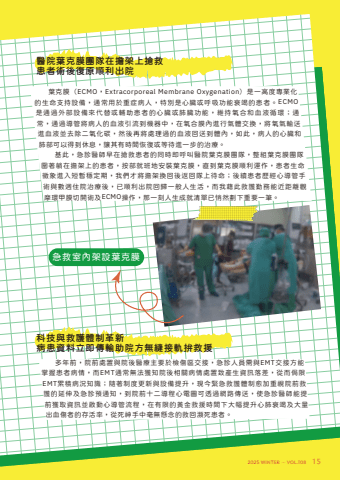 %u79d1%u6280%u8207%u6551%u8b77%u9ad4%u5236%u9769%u65b0 %u75c5%u60a3%u8cc7%u6599%u7acb%u5373%u50b3%u8f38%u52a9%u9662%u65b9%u7121%u7e2b%u63a5%u8ecc%u62da%u6551%u63f4%u8449%u514b%u819c%uff08ECMO%uff0cExtracorporeal Membrane Oxygenation%uff09%u662f%u4e00%u9ad8%u5ea6%u5c08%u696d%u5316%u7684%u751f%u547d%u652f%u6301%u8a2d%u5099%uff0c%u901a%u5e38%u7528%u65bc%u91cd%u75c7%u75c5%u4eba%uff0c%u7279%u5225%u662f%u5fc3%u81df%u6216%u547c%u5438%u529f%u80fd%u8870%u7aed%u7684%u60a3%u8005%u3002ECMO%u662f%u901a%u904e%u5916%u90e8%u8a2d%u5099%u4f86%u4ee3%u66ff%u6216%u8f14%u52a9%u60a3%u8005%u7684%u5fc3%u81df%u6216%u80ba%u81df%u529f%u80fd%uff0c%u7dad%u6301%u6c27%u5408%u548c%u8840%u6db2%u5faa%u74b0%uff1b%u901a%u5e38%uff0c%u901a%u904e%u5c0e%u7ba1%u5c07%u75c5%u4eba%u7684%u8840%u6db2%u5f15%u6d41%u5230%u6a5f%u5668%u4e2d%uff0c%u5728%u6c27%u5408%u819c%u5167%u9032%u884c%u6c23%u9ad4%u4ea4%u63db%uff0c%u5c07%u6c27%u6c23%u8f38%u9001%u9032%u8840%u6db2%u4e26%u53bb%u9664%u4e8c%u6c27%u5316%u78b3%uff0c%u7136%u5f8c%u518d%u5c07%u8655%u7406%u904e%u7684%u8840%u6db2%u56de%u9001%u5230%u9ad4%u5167%uff0c%u5982%u6b64%uff0c%u75c5%u4eba%u7684%u5fc3%u81df%u548c%u80ba%u90e8%u53ef%u4ee5%u5f97%u5230%u4f11%u606f%uff0c%u8b93%u5176%u6709%u6642%u9593%u6062%u5fa9%u6216%u7b49%u5f85%u9032%u4e00%u6b65%u7684%u6cbb%u7642%u3002%u57fa%u6b64%uff0c%u6025%u8a3a%u91ab%u5e2b%u65e9%u5728%u6436%u6551%u60a3%u8005%u7684%u540c%u6642%u5373%u547c%u53eb%u91ab%u9662%u8449%u514b%u819c%u5718%u968a%uff0c%u6574%u7d44%u8449%u514b%u819c%u5718%u968a%u570d%u8457%u8eba%u5728%u64d4%u67b6%u4e0a%u7684%u60a3%u8005%uff0c%u6309%u90e8%u5c31%u73ed%u5730%u5b89%u88dd%u8449%u514b%u819c%uff0c%u76f4%u5230%u8449%u514b%u819c%u9806%u5229%u904b%u4f5c%uff0c%u60a3%u8005%u751f%u547d%u5fb5%u8c61%u9032%u5165%u77ed%u66ab%u7a69%u5b9a%u671f%uff0c%u6211%u5011%u624d%u5c07%u64d4%u67b6%u63db%u56de%u5f8c%u8fd4%u56de%u968a%u4e0a%u5f85%u547d%uff1b%u5f8c%u7e8c%u60a3%u8005%u6b77%u7d93%u5fc3%u5c0e%u7ba1%u624b%u8853%u8207%u6578%u9031%u4f4f%u9662%u6cbb%u7642%u5f8c%uff0c%u5df2%u9806%u5229%u51fa%u9662%u56de%u6b78%u4e00%u822c%u4eba%u751f%u6d3b%uff0c%u800c%u6211%u85c9%u6b64%u6551%u8b77%u52e4%u52d9%u80fd%u8fd1%u8ddd%u96e2%u89c0%u6469%u74b0%u7532%u819c%u5207%u958b%u8853%u53caECMO%u64cd%u4f5c%uff0c%u90a3%u4e00%u523b%u4eba%u751f%u6210%u5c31%u6e05%u55ae%u5df2%u6084%u7136%u5283%u4e0b%u91cd%u8981%u4e00%u7b46%u3002%u591a%u5e74%u524d%uff0c%u9662%u524d%u8655%u7f6e%u8207%u9662%u5f8c%u91ab%u7642%u4e3b%u8981%u65bc%u6aa2%u50b7%u5340%u4ea4%u63a5%uff0c%u6025%u8a3a%u4eba%u54e1%u9700%u8207EMT%u4ea4%u63a5%u65b9%u80fd%u638c%u63e1%u60a3%u8005%u75c5%u60c5%uff0c%u800cEMT%u901a%u5e38%u7121%u6cd5%u7372%u77e5%u9662%u5f8c%u76f8%u95dc%u75c5%u60c5%u8655%u7f6e%u81f4%u7522%u751f%u8cc7%u8a0a%u843d%u5dee%uff0c%u5f9e%u800c%u4fb7%u9650EMT%u7d2f%u7a4d%u75c5%u6cc1%u77e5%u8b58%uff1b%u96a8%u8457%u5236%u5ea6%u66f4%u65b0%u8207%u8a2d%u5099%u63d0%u5347%uff0c%u73fe%u4eca%u7dca%u6025%u6551%u8b77%u9ad4%u5236%u6108%u52a0%u91cd%u8996%u9662%u524d%u6551%u8b77%u7684%u5ef6%u4f38%u53ca%u6025%u8a3a%u9810%u901a%u77e5%uff0c%u5230%u9662%u524d%u5341%u4e8c%u5c0e%u7a0b%u5fc3%u96fb%u5716%u53ef%u900f%u904e%u7db2%u8def%u50b3%u9001%uff0c%u4f7f%u6025%u8a3a%u91ab%u5e2b%u80fd%u63d0%u524d%u7372%u53d6%u8cc7%u8a0a%u4e26%u555f%u52d5%u5fc3%u5c0e%u7ba1%u6d41%u7a0b%uff0c%u5728%u6709%u9650%u7684%u9ec3%u91d1%u6551%u63f4%u6642%u9593%u4e0b%u5927%u5e45%u63d0%u5347%u5fc3%u80ba%u8870%u7aed%u53ca%u5927%u91cf%u51fa%u8840%u50b7%u8005%u7684%u5b58%u6d3b%u7387%uff0c%u5f9e%u6b7b%u795e%u624b%u4e2d%u6beb%u7121%u61f8%u5ff5%u7684%u6551%u56de%u7015%u6b7b%u60a3%u8005%u3002%u91ab%u9662%u8449%u514b%u819c%u5718%u968a%u5728%u64d4%u67b6%u4e0a%u6436%u6551 %u60a3%u8005%u8853%u5f8c%u5fa9%u539f%u9806%u5229%u51fa%u9662%u6025%u6551%u5ba4%u5167%u67b6%u8a2d%u8449%u514b%u819c2025 WINTER %u2014 VOL.108 15