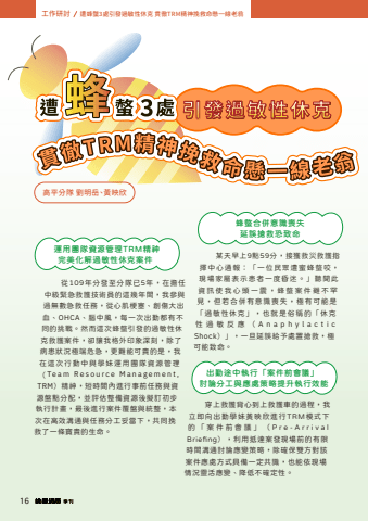 %u5de5%u4f5c%u7814%u8a0e %u906d%u8702%u87ab%ufffd%u8655%u5f15%u767c%u904e%u654f%u6027%u4f11%u514b %u8cab%u5fb9TRM%u7cbe%u795e%u633d%u6551%u547d%u61f8%u4e00%u7dda%u8001%u7fc1%u9ad8%u5e73%u5206%u968a %u5289%u660e%u5cb3%u3001%u9ec3%u6620%u6b23%u5f9e109%u5e74%u5206%u767c%u81f3%u5206%u968a%u5df25%u5e74%uff0c%u5728%u64d4%u4efb%u4e2d%u7d1a%u7dca%u6025%u6551%u8b77%u6280%u8853%u54e1%u7684%u9019%u5e7e%u5e74%u9593%uff0c%u6211%u53c3%u8207%u904e%u7121%u6578%u6025%u6551%u4efb%u52d9%uff0c%u5f9e%u5fc3%u808c%u6897%u585e%u3001%u5275%u50b7%u5927%u51fa%u8840%u3001OHCA%u3001%u8166%u4e2d%u98a8%uff0c%u6bcf%u4e00%u6b21%u51fa%u52e4%u90fd%u6709%u4e0d%u540c%u7684%u6311%u6230%u3002%u7136%u800c%u9019%u6b21%u8702%u87ab%u5f15%u767c%u7684%u904e%u654f%u6027%u4f11%u514b%u6551%u8b77%u6848%u4ef6%uff0c%u537b%u8b93%u6211%u683c%u5916%u5370%u8c61%u6df1%u523b%uff0c%u9664%u4e86%u75c5%u60a3%u72c0%u6cc1%u6975%u7aef%u5371%u6025%uff0c%u66f4%u96e3%u80fd%u53ef%u8cb4%u7684%u662f%uff0c%u6211%u5728%u9019%u6b21%u884c%u52d5%u4e2d%u8207%u5b78%u59b9%u904b%u7528%u5718%u968a%u8cc7%u6e90%u7ba1%u7406%uff08 Te a m R e s o u r c e M a n a g e m e n t , TRM%uff09%u7cbe%u795e%uff0c%u77ed%u6642%u9593%u5167%u9032%u884c%u4e8b%u524d%u4efb%u52d9%u8207%u8cc7%u6e90%u76e4%u9ede%u5206%u914d%uff0c%u4e26%u8a55%u4f30%u6574%u5099%u8cc7%u6e90%u5f8c%u64ec%u8a02%u521d%u6b65%u57f7%u884c%u8a08%u756b%uff0c%u6700%u5f8c%u9032%u884c%u6848%u4ef6%u8986%u76e4%u8207%u7d71%u6574%uff0c%u672c%u6b21%u5728%u9ad8%u6548%u6e9d%u901a%u8207%u4efb%u52d9%u5206%u5de5%u59a5%u7576%u4e0b%uff0c%u5171%u540c%u633d%u6551%u4e86%u4e00%u689d%u5bf6%u8cb4%u7684%u751f%u547d%u3002%u67d0%u5929%u65e9%u4e0a9%u9ede59%u5206%uff0c%u63a5%u7372%u6551%u707d%u6551%u8b77%u6307%u63ee%u4e2d%u5fc3%u901a%u5831%uff1a%u300c%u4e00%u4f4d%u6c11%u773e%u906d%u871c%u8702%u87ab%u54ac%uff0c%u73fe%u5834%u5bb6%u5c6c%u8868%u793a%u60a3%u8005%u4e00%u5ea6%u660f%u8ff7%u3002%u300d%u807d%u805e%u6b64%u8cc7%u8a0a%u4f7f%u6211%u5fc3%u982d%u4e00%u9707%uff0c%u8702%u87ab%u6848%u4ef6%u96d6%u4e0d%u7f55%u898b%uff0c%u4f46%u82e5%u5408%u4f75%u6709%u610f%u8b58%u55aa%u5931%uff0c%u6975%u6709%u53ef%u80fd%u662f%u300c%u904e%u654f%u6027%u4f11%u514b%u300d%uff0c%u4e5f%u5c31%u662f%u4fd7%u7a31%u7684%u300c%u4f11%u514b%u6027%u904e%u654f%u53cd%u61c9%uff08 A n a p h y l a c t i c Shock%uff09%u300d%uff0c%u4e00%u65e6%u5ef6%u8aa4%u7d66%u4e88%u8655%u7f6e%u6436%u6551%uff0c%u6975%u53ef%u80fd%u81f4%u547d%u3002%u7a7f%u4e0a%u6551%u8b77%u80cc%u5fc3%u5230%u4e0a%u6551%u8b77%u8eca%u7684%u904e%u7a0b%uff0c%u6211%u7acb%u5373%u5411%u51fa%u52e4%u5b78%u59b9%u9ec3%u6620%u6b23%u9032%u884cTRM%u6a21%u5f0f%u4e0b%u7684 %u300c %u6848 %u4ef6 %u524d %u6703 %u8b70 %u300d %uff08 P r e - A r r i v a l Briefing%uff09%uff0c%u5229%u7528%u62b5%u9054%u6848%u767c%u73fe%u5834%u524d%u7684%u6709%u9650%u6642%u9593%u6e9d%u901a%u8a0e%u8ad6%u61c9%u8b8a%u7b56%u7565%uff0c%u9664%u78ba%u4fdd%u96d9%u65b9%u5c0d%u8a72%u6848%u4ef6%u61c9%u8655%u65b9%u5f0f%u5177%u5099%u4e00%u5b9a%u5171%u8b58%uff0c%u4e5f%u80fd%u4f9d%u73fe%u5834%u60c5%u6cc1%u9748%u6d3b%u61c9%u8b8a%u3001%u964d%u4f4e%u4e0d%u78ba%u5b9a%u6027%u3002%u904b%u7528%u5718%u968a%u8cc7%u6e90%u7ba1%u7406TRM%u7cbe%u795e%u5b8c%u7f8e%u5316%u89e3%u904e%u654f%u6027%u4f11%u514b%u6848%u4ef6 %u8702%u87ab%u5408%u4f75%u610f%u8b58%u55aa%u5931%u5ef6%u8aa4%u6436%u6551%u6050%u81f4%u547d%u51fa%u52e4%u9014%u4e2d%u57f7%u884c%u300c%u6848%u4ef6%u524d%u6703%u8b70%u300d %u8a0e%u8ad6%u5206%u5de5%u8207%u61c9%u8655%u7b56%u7565%u63d0%u5347%u57f7%u884c%u6548%u80fd16