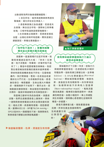%u5b78%u59b9%u96d6%u7136%u624d%u4e0b%u5206%u968a%u4e00%u5e74%u591a%uff0c%u4f46%u57f7%u884c%u529b%u8207%u7d30%u7bc0%u638c%u63e1%u5ea6%u6975%u4f73%uff0c%u8fc5%u901f%u905e%u7d66%u621120%u865f%u91dd%u548c%u9a45%u8840%u5e36%uff0c%u5354%u52a9%u6211%u5efa%u7acb%u975c%u8108%u6ce8%u5c04%uff0c%u4e26%u6e96%u5099500ml%u30010.9%%u751f%u7406%u98df%u9e7d%u6c34( N o r m a l Saline )%uff0c%u958b%u59cb%u78ba%u8a8d%u8f38%u6db2%u7a2e%u985e%u3001%u6aa2%u67e5%u8272%u6fa4%u3001%u6e05%u6f88%u5ea6%u53ca%u6709%u6548%u671f%u9650%u7b49%u4e00%u7cfb%u5217%u55ae%u9805%u6280%u8853%uff0c%u5f8c%u7e8c%u5b78%u59b9%u7d66%u4e88%u975e%u518d%u5438%u5165%u578b%u9762%u7f69%uff08Non-rebreather mask%uff09%uff0c%u6c27%u6c23%u6d41%u91cf%u8abf%u81f3%u9ad8%u6fc3%u5ea6%uff1b%u9a45%u8eca%u524d%u5f80%u91ab%u9662%u904e%u7a0b%u4e2d%uff0c%u75c5%u60a3%u819a%u8272%u7565%u56de%u6eab%uff0c%u8840%u58d3%u5c0f%u5e45%u56de%u5347%uff0c%u8eca%u4e0a%u6301%u7e8c%u76e3%u6e2c%u751f%u547d%u5fb5%u8c61%uff0c%u96a8%u6642%u95dc%u5fc3%u60a3%u8005%u8b8a%u5316%u4e26%u96a8%u6642%u6e96%u5099%u9032%u4e00%u6b65%u8655%u7f6e%u3002%u60a3%u8005%u5171%u906d%u8702%u87ab3%u8655%uff0c%u5c0e%u81f4%u56b4%u91cd%u904e%u654f%u53cd%u61c9%uff0c%u6240%u5e78%u5728%u9ec3%u91d1%u6551%u63f4%u6642%u9593%u5167%u53ca%u6642%u8655%u7f6e%u65b9%u5f97%u4ee5%u633d%u56de%u6027%u547d%u3002%u83dc%u9ce5%u5b78%u59b9%u7d30%u7bc0%u638c%u63e1%u8207%u57f7%u884c%u529b%u6eff%u5206 %u5c55%u73fe%u5353%u8d8a%u5c08%u696d%u5ea6%u51fa%u52e4%u904e%u7a0b%u6211%u5011%u8a0e%u8ad6%u5e7e%u500b%u95dc%u9375%u91cd%u9ede%uff1a1.%u5b89%u5168%u8a55%u4f30%uff1a%u78ba%u4fdd%u5468%u908a%u7121%u8702%u7fa4%u518d%u5ea6%u653b%u64ca%u98a8%u96aa%uff0c%u512a%u5148%u8a55%u4f30%u5b89%u5168%u518d%u9032%u5165%u30022.%u60a3%u8005%u7121%u610f%u8b58%u4e4b%u6025%u6551%u8655%u7f6e%uff1a%u82e5%u60a3%u8005%u5931%u53bb%u610f%u8b58%u3001%u7121%u6cd5%u81ea%u4e3b%u547c%u5438%uff0c%u8acb%u5b78%u59b9%u7acb%u5373%u6e96%u5099%u7d66%u6c27%u3001%u53e3%u54bd%u547c%u5438%u9053%u8207%u888b%u74e3%u7f69%u7526%u9192%u7403%u30023.%u751f%u547d%u5fb5%u8c61%u51fa%u73fe%u7570%u5e38%uff1a%u82e5%u60a3%u8005%u5448%u73fe%u4f4e%u8840%u58d3%u3001%u51fa%u73fe%u7d05%u75b9%u8207%u547c%u5438%u56f0%u96e3%uff0c%u9700%u5feb%u901f%u5efa%u7acb%u975c%u8108%u8def%u5f91%uff0c%u6e96%u5099%u751f%u7406%u98df%u9e7d%u6c34%u3002%u6551%u8b77%u8eca%u4e00%u62b5%u9054%u73fe%u5834%u624d%u62c9%u8d77%u624b%u524e%u8eca%uff0c%u5c31%u807d%u898b%u5bb6%u5c6c%u9060%u5f9e%u5c4b%u5167%u5927%u558a%uff1a%u300c%u5feb%u4f86%uff01%u5728%u88e1%u9762%uff0c%u4ed6%u6c57%u6d41%u6574%u8eab%uff0c%u6709%u6688%u5012%uff0c%u597d%u50cf%u547c%u5438%u4e0d%u904e%u4f86%u4e86%uff01%u300d%u8072%u97f3%u4e2d%u900f%u9732%u8457%u9a5a%u6050%u8207%u7121%u52a9%uff0c%u6211%u8d95%u7dca%u62c9%u8457%u642d%u8f09%u6025%u6551%u88dd%u5099%u7684%u64d4%u67b6%u5e8a%u76f4%u5954%u73fe%u5834%uff0c%u5b78%u59b9%u5247%u63d0%u524d%u63a5%u89f8%u60a3%u8005%u7d66%u4e88%u8a55%u4f30%u3002%u5728%u660f%u6697%u5ba2%u5ef3%u5167%uff0c%u6211%u6253%u958b%u982d%u71c8%uff0c%u770b%u898b%u4e00%u540d%u8001%u7fc1%u7531%u8001%u5a46%u6519%u6276%u5f80%u5927%u9580%u884c%u8d70%uff1b%u751f%u547d%u5fb5%u8c61%u8a55%u4f30%u5f8c%uff0c%u60a3%u8005%u81c9%u8272%u6158%u767d%u3001%u5634%u5507%u816b%u8139%u3001%u5168%u8eab%u51fa%u73fe%u5927%u7247%u8541%u9ebb%u75b9%uff0c%u984d%u982d%u8207%u8116%u5b50%u6c57%u5982%u96e8%u4e0b%uff0c%u96d9%u624b%u51b0%u51b7%uff0c%u642d%u6a48%u52d5%u8108%u53cd%u994b%u5f88%u5fae%u5f31%uff0c%u5fae%u8840%u7ba1%u56de%u5145%u586b%u6642%u9593%u5927%u65bc%u5169%u79d2%uff0c%u8166%u888b%u6d6e%u73fe%u904e%u654f%u6027%u4f11%u514b%u5178%u578b%u75c7%u72c0%u3002%u6211%u7576%u6a5f%u7acb%u65b7%u7814%u5224%u70ba%u5371%u6025%u500b%u6848%uff0c%u9808%u76e1%u901f%u9001%u91ab%u3002%u6211%u5011%u8fc5%u901f%u642c%u904b%u60a3%u8005%u4e0a%u64d4%u67b6%u5e8a%uff0c%u5b78%u59b9%u4e00%u908a%u8a62%u554f%u60a3%u8005%u5bb6%u5c6c%u904e%u53bb%u75c5%u53f2%u4e26%u5c0b%u627e%u87ab%u54ac%u90e8%u4f4d%uff1b%u503c%u6b64%u4e4b%u969b%uff0c%u75c5%u60a3%u96e3%u6709%u610f%u8b58%uff0c%u4f46%u56de%u61c9%u9072%u920d%uff0c%u8108%u640f60%u6b21/%u5206%u3001BP%u50c576/34 mmHg%uff0cSPO2%u5f9e95%%u4e00%u8def%u7de9%u6162%u5411%u4e0b%u6389%uff0c%u6211%u8207%u5b78%u59b9%u5148%u5c0d%u60a3%u8005%u9032%u884c%u975c%u8108%u6ce8%u5c04%u8207%u7d66%u6c27%u8655%u7f6e%u3002%u25b2%u65bd%u6253%u975c%u8108%u7559%u7f6e%u91dd%u25b2%u6aa2%u67e5%u8f38%u6db2%u7a2e%u985e%u3001%u8272%u6fa4%u3001%u6e05%u6f88%u5ea6%u53ca%u6709%u6548%u671f%u300c%u4ed6%u547c%u5438%u4e0d%u904e%u4f86%uff01%u300d%u5bb6%u5c6c%u5436%u558a%u8072%u50b3%u4f86%u6ea2%u51fa%u5c4f%u5e55%u7684%u9a5a%u6050%u8207%u7121%u52a9