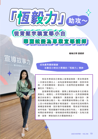 %u694a%u6885%u5206%u968a %u5f35%u5a67%u598d%u6210%u70ba%u512a%u79c0%u8b1b%u5e2b%u95dc%u9375%u5728%u6578%u767e%u5c0f%u6642%u529f%u529b%u7d2f%u7a4d%u7684%u300c%u6046%u6bc5%u529b%u300d%u7cbe%u795e%u6211%u5f9e%u672a%u60f3%u904e%u81ea%u5df1%u6703%u8e0f%u4e0a%u5ba3%u5c0e%u9019%u689d%u8def%uff0c%u66f4%u6c92%u60f3%u904e%u6709%u4e00%u5929%u6703%u7ad9%u5728%u8b1b%u53f0%u4e0a%uff0c%u6210%u70ba%u5ba3%u5c0e%u9818%u57df%u7684%u8b1b%u5e2b%uff0c%u56de%u9996%u4f86%u6642%u8def%uff0c%u624d%u6df1%u523b%u9ad4%u6703%u5230%uff1a%u8981%u6210%u70ba%u4e00%u540d%u512a%u79c0%u7684%u5ba3%u5c0e%u8b1b%u5e2b%uff0c%u95dc%u9375%u5728%u65bc%u300c%u6046%u6bc5%u529b%u300d%u3002%u5ba3%u5c0e%u8ab2%u7a0b%u770b%u4f3c%u8f15%u9b06%uff0c%u5be6%u969b%u4e0a%u8981%u5c07%u62bd%u8c61%u591a%u5143%u7684%u6982%u5ff5%u5177%u8c61%u5316%u3001%u8996%u89ba%u5316%uff0c%u975e%u5e38%u8003%u9a57%u8b1b%u5e2b%u529f%u529b%uff0c%u5c24%u5176%u6388%u8ab2%u7bc4%u7587%u5ee3%u6cdb%u5982%u6545%u4e8b%u529b%u3001%u7c21%u5831%u88fd%u4f5c%u3001%u6e9d%u901a%u8868%u9054%u3001%u5716%u5361%u8a2d%u8a08%u3001%u8ab2%u7a0b%u67b6%u69cb%u5230%u821e%u53f0%u9b45%u529b%uff0c%u6bcf%u4e00%u9805%u90fd%u9700%u8981%u6642%u9593%u7cbe%u5fc3%u6253%u78e8%uff0c%u53ca%u4e0a%u767e%u5c0f%u6642%u7d93%u9a57%u7684%u7d2f%u7a4d%u624d%u7565%u898b%u96db%u5f62%uff0c%u800c%u5982%u4f55%u5728%u77ed%u6642%u9593%u5167%u5efa%u69cb%u5ba3%u5c0e%u67b6%u69cb%u3001%u8a2d%u8a08%u88fd%u4f5c%u5438%u775b%u7c21%u5831%u3001%u770b%u5230%u9010%u5b57%u7a3f%u5c31%u80fd%u5982%u547c%u5438%u822c%u300c%u770b%u5230%u95dc%u9375%u5b57%u5373%u8b1b%u51fa%u7cbe%u5f69%u5167%u5bb9%u300d%uff0c%u751a%u81f3%u8ab2%u7a0b%u6642%u9593%u7684%u7cbe%u6e96%u638c%u63a7%uff0c%u90fd%u501a%u8cf4%u9577%u6642%u9593%u53cd%u8986%u7df4%u7fd2%uff0c%u53ca%u6bcf%u6b21%u6388%u8ab2%u3001%u5ba3%u5c0e%u3001%u89e3%u8aaa%u5f8c%u7684%u6b21%u6b21%u8986%u76e4%u8207%u4fee%u6b63%u30022025 WINTER %u2014 VOL.108 19