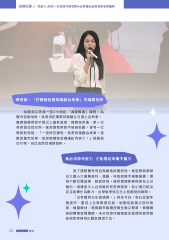 %u5b78%u9577%u8aaa%uff1a%u300c%u597d%u8ab2%u7a0b%u5c31%u662f%u77e5%u8b58%u878d%u5408%u6545%u4e8b%u300d%u6210%u5099%u8ab2%u9996%u5247%u5f8c%u7e8c%u6211%u53c8%u627f%u63a5%u4e00%u58022%u5c0f%u6642%u7684%u300c%u6e9d%u901a%u6230%u8853%u300d%u8ab2%u7a0b%u3002%u70ba%u8b93%u5167%u5bb9%u63a5%u5730%u6c23%uff0c%u6211%u5c07%u6d88%u9632%u5c08%u696d%u77e5%u8b58%u878d%u5408%u65e5%u5e38%u751f%u6d3b%u6545%u4e8b%uff0c%u8b93%u7406%u8ad6%u8b8a%u5f97%u66f4%u5e73%u6613%u8fd1%u4eba%u5bcc%u6709%u6eab%u5ea6%uff1b%u8ab2%u7a0b%u7d50%u675f%u5f8c%uff0c%u7b2c%u4e00%u6b21%u6709%u5b78%u54e1%u627e%u6211%u5408%u7167%uff0c%u751a%u81f3%u8ddf%u6211%u7d22%u53d6%u624b%u7e6a%u7c3d%u540d%u5716%u3002%u66fe%u6709%u4e00%u4f4d%u5b78%u9577%u5c0d%u6211%u8aaa%uff1a%u300c%u4e00%u5802%u597d%u7684%u8ab2%u7a0b%uff0c%u5c31%u662f%u77e5%u8b58%u878d%u5408%u6545%u4e8b%uff0c%u7576%u807d%u773e%u807d%u5b8c%u6545%u4e8b%uff0c%u4e5f%u5b78%u6703%u8b1b%u8005%u60f3%u50b3%u9054%u7684%u5167%u5bb9%u4e86%u3002%u300d%u5b78%u9577%u6bb7%u5207%u53ee%u5680%uff0c%u81ea%u6b64%u6210%u70ba%u6211%u5099%u8ab2%u9996%u5247%u3002%u6211%u5fc5%u9808%u975e%u5e38%u52aa%u529b %u624d%u80fd%u770b%u8d77%u4f86%u6beb%u4e0d%u8cbb%u529b%u70ba%u4e86%u8b93%u7c21%u5831%u4fdd%u6709%u81ea%u6211%u98a8%u683c%u8207%u7368%u7279%u6027%uff0c%u6bcf%u5802%u8ab2%u6211%u90fd%u50be%u6ce8%u5927%u91cf%u5fc3%u529b%u8490%u96c6%u8cc7%u6599%u3001%u9078%u5716%u3001%u6392%u7248%u5230%u89aa%u624b%u7e6a%u88fd%u63d2%u756b%uff1b%u8ab2%u524d%u4e0d%u65b7%u53cd%u8986%u6f14%u7df4%u3001%u9304%u97f3%u8a08%u6642%uff0c%u78ba%u4fdd%u8b1b%u8ab2%u7bc0%u594f%u8aa4%u5dee%u5728%u4e09%u5206%u9418%u5167%u3002%u78e8%u7df4%u81f3%u4eca%u4e0a%u53f0%u524d%u96d6%u4ecd%u6709%u4e9b%u5fae%u7dca%u5f35%uff0c%u4f46%u5fc3%u60c5%u5df2%u8f03%u6de1%u5b9a%u4e14%u80fd%u8f49%u5316%u70ba%u52d5%u529b%uff0c%u4e26%u5b78%u6703%u4eab%u53d7%u5728%u53f0%u4e0a%u88ab%u807d%u898b%u7684%u77ac%u9593%u3002%u300c%u6c92%u6709%u8b1b%u5e2b%u5929%u751f%u6703%u8b1b%u8ab2%u3002%u300d%u6642%u81f3%u4eca%u65e5%uff0c%u6211%u5df2%u5f9e%u7576%u5e74%u8a9e%u901f%u5feb%u3001%u9084%u6c92%u4e0a%u53f0%u5c31%u7dca%u5f35%u7684%u6211%uff0c%u86fb%u8b8a%u6210%u80fd%u7368%u7acb%u8a2d%u8a08%u6559%u6848%u3001%u7e6a%u88fd%u6559%u6750%u3001%u7372%u5f97%u807d%u773e%u7a31%u8b9a%u6388%u8ab2%u751f%u52d5%u53c8%u5c08%u696d%uff0c%u83ef%u9e97%u8f49%u8eab%u7684%u5c08%u696d%u5ba3%u5c0e%u8b1b%u5e2b%uff0c%u672a%u4f86%u6211%u5c07%u6301%u7e8c%u7cbe%u9032%u4e26%u767c%u63ee%u6240%u9577%u7528%u8072%u97f3%u8207%u6545%u4e8b%u5c07%u9632%u707d%u89c0%u5ff5%u50b3%u905e%u4e0b%u53bb%u300222 %u8a13%u7df4%u7d00%u8981 %u300c%u6046%u6bc5%u529b%u300d%u52a9%u653b%uff5e%u5f9e%u80cc%u9010%u5b57%u7a3f%u5ba3%u5c0e%u5c0f%u767d%u83ef%u9e97%u86fb%u8b8a%u70ba%u5c08%u696d%u5ba3%u5c0e%u8b1b%u5e2b