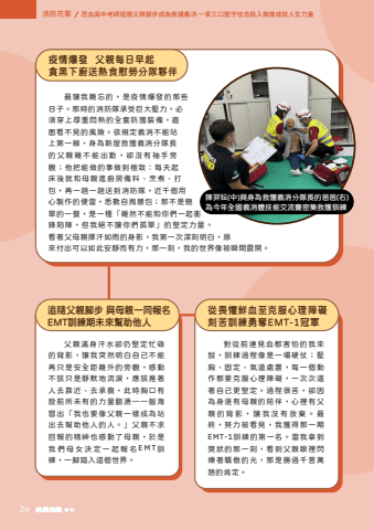%u6700%u8b93%u6211%u96e3%u5fd8%u7684%uff0c%u662f%u75ab%u60c5%u7206%u767c%u7684%u90a3%u4e9b%u65e5%u5b50%u3002%u90a3%u6642%u7684%u6d88%u9632%u968a%u627f%u53d7%u5de8%u5927%u58d3%u529b%uff0c%u5fc5%u9808%u7a7f%u4e0a%u539a%u91cd%u60b6%u71b1%u7684%u5168%u5957%u9632%u8b77%u88dd%u5099%uff0c%u76f4%u9762%u770b%u4e0d%u898b%u7684%u98a8%u96aa%u3002%u4f9d%u898f%u5b9a%u7fa9%u6d88%u4e0d%u80fd%u7ad9%u4e0a%u7b2c%u4e00%u7dda%uff0c%u8eab%u70ba%u65b0%u5c4b%u6551%u8b77%u7fa9%u6d88%u5206%u968a%u9577%u7684%u7236%u89aa%u96d6%u4e0d%u80fd%u51fa%u52e4%uff0c%u537b%u6c92%u6709%u8896%u624b%u65c1%u89c0%uff1b%u4ed6%u628a%u80fd%u505a%u7684%u4e8b%u505a%u5230%u6975%u81f4%uff1a%u6bcf%u5929%u8d77%u5e8a%u5f8c%u5c31%u548c%u6bcd%u89aa%u9032%u5eda%u623f%u5099%u6599%u3001%u70f9%u716e%u3001%u6253%u5305%uff0c%u518d%u4e00%u8d9f%u4e00%u8d9f%u9001%u5230%u6d88%u9632%u968a%uff0c%u8fd1%u5343%u500b%u7528%u5fc3%u88fd%u4f5c%u7684%u4fbf%u7576%uff0c%u6089%u6578%u81ea%u638f%u8170%u5305%uff1b%u90a3%u4e0d%u662f%u7c21%u55ae%u7684%u4e00%u9910%uff0c%u662f%u4e00%u7a2e%u300c%u96d6%u7136%u4e0d%u80fd%u548c%u4f60%u5011%u4e00%u8d77%u885d%u92d2%u9677%u9663%uff0c%u4f46%u6211%u7d55%u4e0d%u8b93%u4f60%u5011%u5b64%u55ae%u300d%u7684%u5805%u5b9a%u529b%u91cf%u3002%u770b%u8457%u7236%u6bcd%u89aa%u63ee%u6c57%u5982%u96e8%u7684%u8eab%u5f71%uff0c%u6211%u7b2c%u4e00%u6b21%u6df1%u523b%u660e%u767d%uff0c%u539f%u4f86%u4ed8%u51fa%u53ef%u4ee5%u5982%u6b64%u5b89%u975c%u800c%u6709%u529b%uff0c%u90a3%u4e00%u523b%uff0c%u6211%u7684%u4e16%u754c%u50cf%u88ab%u77ac%u9593%u9707%u958b%u3002%u75ab%u60c5%u7206%u767c %u7236%u89aa%u6bcf%u65e5%u65e9%u8d77%u8caa%u9ed1%u4e0b%u5eda%u9001%u71b1%u98df%u6170%u52de%u5206%u968a%u5925%u4f34%u7236%u89aa%u6eff%u8eab%u6c57%u6c34%u537b%u4ecd%u5805%u5b9a%u5fd9%u788c%u7684%u80cc%u5f71%uff0c%u8b93%u6211%u7a81%u7136%u660e%u767d%u81ea%u5df1%u4e0d%u80fd%u518d%u53ea%u662f%u5b89%u5168%u8ddd%u96e2%u5916%u7684%u65c1%u89c0%uff0c%u611f%u52d5%u4e0d%u8a72%u53ea%u662f%u975c%u9ed8%u5730%u6d41%u6dda%uff0c%u61c9%u8a72%u63a8%u8457%u4eba%u53bb%u9760%u8fd1%u3001%u53bb%u627f%u64d4%uff0c%u6b64%u6642%u80f8%u53e3%u6709%u80a1%u524d%u6240%u672a%u6709%u7684%u529b%u91cf%u7ffb%u6e67%u2014%u2014%u8166%u6d77%u5192%u51fa%u300c%u6211%u4e5f%u8981%u50cf%u7236%u89aa%u4e00%u6a23%u6210%u70ba%u7ad9%u51fa%u53bb%u5e6b%u52a9%u4ed6%u4eba%u7684%u4eba%u3002%u300d%u7236%u89aa%u4e0d%u6c42%u56de%u5831%u7684%u7cbe%u795e%u4e5f%u611f%u52d5%u4e86%u6bcd%u89aa%uff0c%u65bc%u662f%u6211%u5011%u6bcd%u5973%u6c7a%u5b9a%u4e00%u8d77%u5831%u540d EMT%u8a13%u7df4%uff0c%u4e00%u8173%u8e0f%u5165%u9019%u500b%u4e16%u754c%u3002%u8ffd%u96a8%u7236%u89aa%u8173%u6b65 %u8207%u6bcd%u89aa%u4e00%u540c%u5831%u540dEMT%u8a13%u7df4%u671f%u672a%u4f86%u5e6b%u52a9%u4ed6%u4eba%u5c0d%u5f9e%u524d%u9023%u898b%u8840%u90fd%u5bb3%u6015%u7684%u6211%u4f86%u8aaa%uff0c%u8a13%u7df4%u904e%u7a0b%u50cf%u662f%u4e00%u5834%u786c%u4ed7%uff1b%u58d3%u80f8%u3001%u56fa%u5b9a%u3001%u6c23%u9053%u8655%u7f6e%uff0c%u6bcf%u4e00%u500b%u52d5%u4f5c%u90fd%u8981%u514b%u670d%u5fc3%u7406%u969c%u7919%uff0c%u4e00%u6b21%u6b21%u903c%u8457%u81ea%u5df1%u66f4%u5805%u5b9a%u3002%u904e%u7a0b%u5f88%u82e6%uff0c%u537b%u56e0%u70ba%u8eab%u908a%u6709%u6bcd%u89aa%u7684%u966a%u4f34%uff0c%u5fc3%u88e1%u6709%u7236%u89aa%u7684%u80cc%u5f71%uff0c%u8b93%u6211%u6c92%u6709%u653e%u68c4%u3002%u6700%u7d42%uff0c%u52aa%u529b%u88ab%u770b%u898b%uff0c%u6211%u7372%u5f97%u90a3%u4e00%u671fEMT-1%u8a13%u7df4%u7684%u7b2c%u4e00%u540d%u3002%u7576%u6211%u62ff%u5230%u734e%u72c0%u7684%u90a3%u4e00%u523b%uff0c%u770b%u5230%u7236%u89aa%u773c%u88e1%u9583%u720d%u8457%u9a55%u50b2%u7684%u5149%uff0c%u90a3%u662f%u52dd%u904e%u5343%u8a00%u842c%u8a9e%u7684%u80af%u5b9a%u3002%u5f9e%u754f%u61fc%u9bae%u8840%u81f3%u514b%u670d%u5fc3%u7406%u969c%u7919 %u523b%u82e6%u8a13%u7df4%u52c7%u596aEMT-1%u51a0%u8ecd%u9673%u7fbf%u5998(%u4e2d)%u8207%u8eab%u70ba%u6551%u8b77%u7fa9%u6d88%u5206%u968a%u9577%u7684%u7238%u7238(%u53f3)%u70ba%u4eca%u5e74%u5168%u570b%u7fa9%u6d88%u9ad4%u6280%u80fd%u4ea4%u6d41%u8cfd%u5bc6%u96c6%u6551%u8b77%u8a13%u7df4%u6d88%u9632%u82b1%u7d6e %u6050%u8840%u9ad8%u4e2d%u8001%u5e2b%u8ffd%u96a8%u7236%u89aa%u8173%u6b65%u6210%u70ba%u6551%u8b77%u7fa9%u6d88 %u4e00%u5bb6%u4e09%u53e3%u5805%u5b88%u4fe1%u5ff5%u6295%u5165%u6551%u63f4%u6210%u5c31%u4eba%u751f%u529b%u91cf24