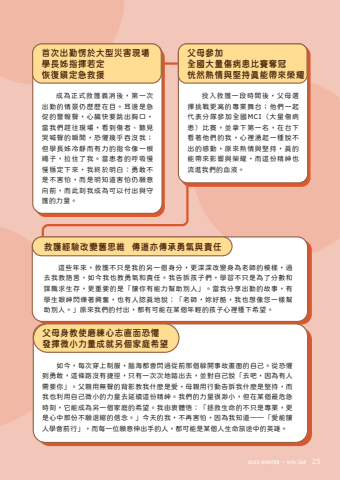 %u9019%u4e9b%u5e74%u4f86%uff0c%u6551%u8b77%u4e0d%u53ea%u662f%u6211%u7684%u53e6%u4e00%u500b%u8eab%u5206%uff0c%u66f4%u6df1%u6df1%u6539%u8b8a%u8eab%u70ba%u8001%u5e2b%u7684%u6a21%u6a23%uff0c%u904e%u53bb%u6211%u6559%u8a9e%u8a00%uff0c%u5982%u4eca%u6211%u4e5f%u6559%u52c7%u6c23%u548c%u8cac%u4efb%u3002%u6211%u544a%u8a34%u5b69%u5b50%u5011%uff0c%u5b78%u7fd2%u4e0d%u53ea%u662f%u70ba%u4e86%u5206%u6578%u548c%u8b00%u8077%u6c42%u751f%u5b58%uff0c%u66f4%u91cd%u8981%u7684%u662f%u300c%u8b93%u4f60%u6709%u80fd%u529b%u5e6b%u52a9%u5225%u4eba%u300d%u3002%u7576%u6211%u5206%u4eab%u51fa%u52e4%u7684%u6545%u4e8b%uff0c%u6709%u5b78%u751f%u773c%u795e%u9583%u720d%u8457%u8208%u596e%uff0c%u4e5f%u6709%u4eba%u8a8d%u771f%u5730%u8aaa%uff1a%u300c%u8001%u5e2b%uff0c%u59b3%u597d%u9177%uff0c%u6211%u4e5f%u60f3%u50cf%u60a8%u4e00%u6a23%u5e6b%u52a9%u5225%u4eba%u3002%u300d%u539f%u4f86%u6211%u5011%u7684%u4ed8%u51fa%uff0c%u90fd%u6709%u53ef%u80fd%u5728%u67d0%u500b%u5e74%u8f15%u7684%u5b69%u5b50%u5fc3%u88e1%u7a2e%u4e0b%u5e0c%u671b%u3002%u6551%u8b77%u7d93%u9a57%u6539%u8b8a%u820a%u601d%u7dad %u50b3%u9053%u4ea6%u50b3%u627f%u52c7%u6c23%u8207%u8cac%u4efb%u6210%u70ba%u6b63%u5f0f%u6551%u8b77%u7fa9%u6d88%u5f8c%uff0c%u7b2c%u4e00%u6b21%u51fa%u52e4%u7684%u60c5%u666f%u4ecd%u6b77%u6b77%u5728%u76ee%u3002%u8033%u908a%u662f%u6025%u4fc3%u7684%u8b66%u5831%u8072%uff0c%u5fc3%u81df%u5feb%u8981%u8df3%u51fa%u80f8%u53e3%uff0c%u7576%u6211%u5011%u8d95%u5f80%u73fe%u5834%uff0c%u770b%u5230%u50b7%u8005%u3001%u807d%u898b%u54ed%u558a%u8072%u7684%u77ac%u9593%uff0c%u6050%u61fc%u5e7e%u4e4e%u541e%u6c92%u6211%uff1b%u4f46%u5b78%u9577%u59ca%u51b7%u975c%u800c%u6709%u529b%u7684%u6307%u4ee4%u50cf%u4e00%u6839%u7e69%u5b50%uff0c%u62c9%u4f4f%u4e86%u6211%u3002%u7576%u60a3%u8005%u7684%u547c%u5438%u6162%u6162%u7a69%u5b9a%u4e0b%u4f86%uff0c%u6211%u7d42%u65bc%u660e%u767d%uff1a%u52c7%u6562%u4e0d%u662f%u4e0d%u5bb3%u6015%uff0c%u800c%u662f%u660e%u77e5%u9053%u5bb3%u6015%u4ecd%u9858%u610f%u5411%u524d%uff0c%u800c%u6b64%u523b%u6211%u6210%u70ba%u53ef%u4ee5%u4ed8%u51fa%u8207%u5b88%u8b77%u7684%u529b%u91cf%u3002%u9996%u6b21%u51fa%u52e4%u6123%u65bc%u5927%u578b%u707d%u5bb3%u73fe%u5834 %u5b78%u9577%u59ca%u6307%u63ee%u82e5%u5b9a%u6062%u5fa9%u93ae%u5b9a%u6025%u6551%u63f4%u6295%u5165%u6551%u8b77%u4e00%u6bb5%u6642%u9593%u5f8c%uff0c%u7236%u6bcd%u9078%u64c7%u6311%u6230%u66f4%u9ad8%u7684%u5c08%u696d%u821e%u53f0%uff1b%u4ed6%u5011%u4e00%u8d77%u4ee3%u8868%u5206%u968a%u53c3%u52a0%u5168%u570bMCI%uff08%u5927%u91cf%u50b7%u75c5%u60a3%uff09%u6bd4%u8cfd%uff0c%u4e26%u62ff%u4e0b%u7b2c%u4e00%u540d%uff0c%u5728%u53f0%u4e0b%u770b%u8457%u4ed6%u5011%u7684%u6211%uff0c%u5fc3%u88e1%u6e67%u8d77%u4e00%u7a2e%u8aaa%u4e0d%u51fa%u7684%u611f%u52d5%uff0c%u539f%u4f86%u71b1%u60c5%u8207%u5805%u6301%uff0c%u771f%u7684%u80fd%u5e36%u4f86%u5f71%u97ff%u8207%u69ae%u8000%uff0c%u800c%u9019%u4efd%u7cbe%u795e%u4e5f%u6d41%u9032%u6211%u5011%u7684%u8840%u6db2%u3002%u7236%u6bcd%u53c3%u52a0%u5168%u570b%u5927%u91cf%u50b7%u75c5%u60a3%u6bd4%u8cfd%u596a%u51a0 %u604d%u7136%u71b1%u60c5%u8207%u5805%u6301%u771f%u80fd%u5e36%u4f86%u69ae%u8000%u5982%u4eca%uff0c%u6bcf%u6b21%u7a7f%u4e0a%u5236%u670d%uff0c%u8166%u6d77%u90fd%u6703%u9583%u904e%u5f9e%u524d%u90a3%u500b%u8eb2%u958b%u4e8b%u6545%u756b%u9762%u7684%u81ea%u5df1%u3002%u5f9e%u6050%u61fc%u5230%u52c7%u6562%uff0c%u9019%u689d%u8def%u6c92%u6709%u6377%u5f91%uff0c%u53ea%u6709%u4e00%u6b21%u6b21%u5730%u8e0f%u51fa%u53bb%uff0c%u4e26%u5c0d%u81ea%u5df1%u8aaa%u300c%u53bb%u5427%uff0c%u56e0%u70ba%u6709%u4eba%u9700%u8981%u4f60%u300d%u3002%u7236%u89aa%u7528%u7121%u8072%u7684%u80cc%u5f71%u6559%u6211%u4ec0%u9ebc%u662f%u611b%uff0c%u6bcd%u89aa%u7528%u884c%u52d5%u544a%u8a34%u6211%u4ec0%u9ebc%u662f%u5805%u6301%uff0c%u800c%u6211%u4e5f%u5229%u7528%u81ea%u5df1%u5fae%u5c0f%u7684%u529b%u91cf%u53bb%u5ef6%u7e8c%u9019%u4efd%u7cbe%u795e%u3002%u6211%u5011%u7684%u529b%u91cf%u5f88%u6e3a%u5c0f%uff0c%u4f46%u5728%u67d0%u500b%u6700%u5371%u6025%u6642%u523b%uff0c%u5b83%u80fd%u6210%u70ba%u53e6%u4e00%u500b%u5bb6%u5ead%u7684%u5e0c%u671b%u3002%u6211%u7531%u8877%u9ad4%u609f%uff1a%u300c%u62ef%u6551%u751f%u547d%u7684%u4e0d%u53ea%u662f%u5c08%u696d%uff0c%u66f4%u662f%u5fc3%u4e2d%u90a3%u4efd%u4e0d%u9858%u9000%u7e2e%u7684%u4fe1%u5ff5%u3002%u300d%u4eca%u5929%u7684%u6211%uff0c%u4e0d%u518d%u5bb3%u6015%uff0c%u56e0%u70ba%u6211%u77e5%u9053%u2014%u2014%u300c%u611b%u80fd%u8b93%u4eba%u5b78%u6703%u524d%u884c%u300d%uff0c%u800c%u6bcf%u4e00%u4f4d%u9858%u610f%u4f38%u51fa%u624b%u7684%u4eba%uff0c%u90fd%u53ef%u80fd%u662f%u67d0%u500b%u4eba%u751f%u547d%u65c5%u9014%u4e2d%u7684%u82f1%u96c4%u3002%u7236%u6bcd%u8eab%u6559%u4f7f%u78e8%u7df4%u5fc3%u5fd7%u76f4%u9762%u6050%u61fc %u767c%u63ee%u5fae%u5c0f%u529b%u91cf%u6210%u5c31%u53e6%u500b%u5bb6%u5ead%u5e0c%u671b2025 WINTER %u2014 VOL.108 25