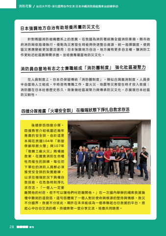 %u91dd%u5c0d%u5169%u570b%u6d88%u9632%u7d44%u7e54%u9ad4%u7cfb%u4e0a%u7684%u5dee%u7570%uff0c%u5728%u6211%u570b%u70ba%u6d88%u9632%u7f72%u7d71%u7c4c%u5168%u570b%u6d88%u9632%u696d%u52d9%uff0c%u7e23%u5e02%u653f%u5e9c%u6d88%u9632%u5c40%u4f9d%u6307%u5c0e%u57f7%u884c%uff0c%u512a%u9ede%u70ba%u707d%u5bb3%u767c%u751f%u6642%u80fd%u5920%u5feb%u901f%u6574%u5408%u8cc7%u6e90%u3001%u7d71%u4e00%u6307%u63ee%u8abf%u5ea6%uff0c%u4f7f%u8de8%u5340%u707d%u5bb3%u61c9%u8b8a%u80fd%u66f4%u52a0%u9748%u6d3b%u904b%u7528%uff1b%u65e5%u672c%u5f37%u8abf%u5730%u65b9%u81ea%u6cbb%uff0c%u5730%u65b9%u64c1%u6709%u66f4%u591a%u81ea%u4e3b%u6b0a%uff0c%u8b93%u6d88%u9632%u5de5%u4f5c%u66f4%u8cbc%u8fd1%u793e%u5340%u5be6%u969b%u9700%u6c42%u9762%uff0c%u4e26%u57f9%u990a%u5c08%u5c6c%u7576%u5730%u9632%u707d%u6587%u5316%u3002%u5728%u4eba%u54e1%u5236%u5ea6%u4e0a%uff0c%u65e5%u672c%u4ecd%u4fdd%u7559%u50b3%u7d71%u300c%u6d88%u9632%u5718%u5236%u5ea6%u300d%uff0c%u985e%u4f3c%u53f0%u7063%u7fa9%u6d88%u5236%u5ea6%uff0c%u4eba%u54e1%u591a%u534a%u7531%u7576%u5730%u4eba%u58eb%u7d44%u6210%uff0c%u5e73%u6642%u7686%u6709%u5c08%u8077%u5de5%u4f5c%uff0c%u7576%u706b%u707d%u3001%u5730%u9707%u7b49%u707d%u5bb3%u767c%u751f%u6642%u624d%u6295%u5165%u6551%u63f4%uff1b%u6d88%u9632%u5718%u5728%u65e5%u672c%u793e%u6703%u6b77%u53f2%u60a0%u4e45%uff0c%u9664%u8c61%u5fb5%u793e%u5340%u51dd%u805a%u529b%u8207%u50b3%u627f%u9632%u707d%u6587%u5316%uff0c%u4ea6%u5c55%u73fe%u65e5%u672c%u793e%u5340%u9632%u707d%u97cc%u6027%u3002%u5f8c%u7e8c%u53c3%u8a2a%u56db%u641c%u5206%u968a%uff0c%u56db%u641c%u6559%u5b98%u4ecb%u7d39%u6843%u5712%u8fd1%u5e7e%u5e74%u63a8%u5ee3%u7684%u5b89%u5168%u8a13%uff0c%u7531%u65bc%u9019%u662f%u672c%u5c40%u5728%u6c11%u570b104%u5e74%u300c%u65b0%u5c4b%u4fdd%u9f61%u7403%u9928%u706b%u8b66%u300d%u8207107%u5e74%u300c%u656c%u9d6c%u5de5%u5ee0%u706b%u707d%u300d%u5169%u5834%u6436%u6551%u6848%uff0c%u5728%u5bf6%u8cb4%u6d88%u9632%u751f%u547d%u72a7%u7272%u800c%u50ac%u751f%u7684%u8a13%u7df4%uff0c%u6bcf%u4f4d%u521d%u4e0b%u55ae%u4f4d%u7684%u6d88%u9632%u4eba%u54e1%u90fd%u5fc5%u9808%u63a5%u53d7%u5b89%u5168%u8a13%u7684%u7d2e%u5be6%u78e8%u7df4%uff0c%u4ee5%u6c42%u5728%u6975%u7aef%u72c0%u6cc1%u4e0b%u5177%u5099%u81ea%u6551%u6280%u80fd%uff0c%u5728%u5371%u6025%u6642%u523b%u6399%u624e%u6c42%u5b58%u6d3b%u3002%u300c%u4e00%u500b%u4eba%u4e00%u5b9a%u8981%u96e2%u958b%u4ed6%u7684%u6751%u838a%uff0c%u4f46%u4e0d%u53ef%u4ee5%u8b93%u4ed6%u5011%u6751%u838a%u96e2%u958b%u4ed6%u3002%u300d%u5728%u4e00%u6b21%u570b%u5167%u8209%u8fa6%u7684%u7e69%u7d22%u6551%u63f4%u8ad6%u58c7%u4e2d%u807d%u5230%u7684%u9019%u6bb5%u8a71%uff0c%u9019%u53e5%u8a71%u9ad4%u73fe%u4e86%u4e00%u500b%u4eba%u5c0d%u65bc%u4f7f%u547d%u8207%u6839%u6e90%u7684%u5805%u6301%u8207%u60c5%u611f%uff0c%u6551%u707d%u4e0d%u5206%u570b%u754c%uff0c%u6551%u63f4%u4e0d%u5206%u5f7c%u6b64%uff0c%u671f%u8a31%u5728%u672a%u4f86%u80fd%u6210%u70ba%u4e00%u500b%u4e32%u806f%u8d77%u53f0%u65e5%u6551%u63f4%u7684%u5e73%u53f0%uff0c%u642d%u8d77%u5fc3%u4e2d%u53f0%u65e5%u4ea4%u6d41%u7684%u6a4b%uff0c%u6301%u7e8c%u9f4a%u805a%u4e00%u5802%u5206%u4eab%u4ea4%u6d41%uff0c%u57f9%u990a%u5171%u540c%u8a9e%u8a00%u3002%u6d88%u9632%u82b1%u7d6e %u53f0%u65e5%u5927%u4e0d%u540c~%u6df1%u5316%u570b%u969b%u5408%u4f5c%u4ea4%u6d41 %u65e5%u672c%u6c96%u7e69%u6d88%u9632%u54e1%u7d44%u5718%u4f86%u53f0%u8a13%u7df4%u53c3%u8a2a28