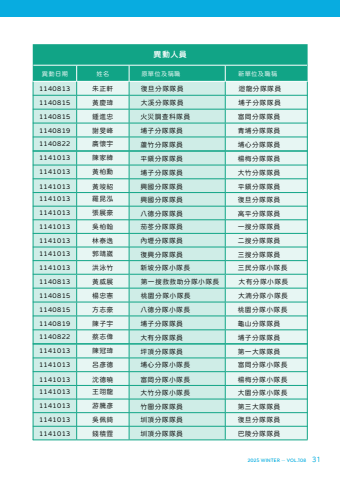 1140813 %u9ec3%u5a01%u5c55 %u7b2c%u4e00%u641c%u6551%u6551%u52a9%u5206%u968a%u5c0f%u968a%u9577 %u5927%u6709%u5206%u968a%u5c0f%u968a%u95771140815 %u694a%u5fe0%u61b2 %u6843%u5712%u5206%u968a%u5c0f%u968a%u9577 %u5927%u6e73%u5206%u968a%u5c0f%u968a%u95771140815 %u65b9%u5fd7%u8c6a %u516b%u5fb7%u5206%u968a%u5c0f%u968a%u9577 %u6843%u5712%u5206%u968a%u5c0f%u968a%u95771140819 %u9673%u5b50%u5b87 %u57d4%u5b50%u5206%u968a%u968a%u54e1 %u9f9c%u5c71%u5206%u968a%u968a%u54e11140822 %u8521%u5fd7%u5049 %u5927%u6709%u5206%u968a%u968a%u54e1 %u57d4%u5b50%u5206%u968a%u968a%u54e11141013 %u9673%u51a0%u744b %u576a%u9802%u5206%u968a%u968a%u54e1 %u7b2c%u4e00%u5927%u968a%u968a%u54e11141013 %u5442%u5f65%u5fb7 %u57d4%u5fc3%u5206%u968a%u5c0f%u968a%u9577 %u5bcc%u5ca1%u5206%u968a%u5c0f%u968a%u95771141013 %u6c88%u5fb7%u66c9 %u5bcc%u5ca1%u5206%u968a%u5c0f%u968a%u9577 %u694a%u6885%u5206%u968a%u5c0f%u968a%u95771141013 %u738b%u7fca%u9f8d %u5927%u7af9%u5206%u968a%u5c0f%u968a%u9577 %u5927%u5712%u5206%u968a%u5c0f%u968a%u95771141013 %u6e38%u9a30%u5f65 %u7af9%u570d%u5206%u968a%u968a%u54e1 %u7b2c%u4e09%u5927%u968a%u968a%u54e11141013 %u5433%u4f69%u9321 %u5733%u9802%u5206%u968a%u968a%u54e1 %u5fa9%u65e6%u5206%u968a%u968a%u54e11141013 %u9322%u7a4d%u9706 %u5733%u9802%u5206%u968a%u968a%u54e1 %u5df4%u9675%u5206%u968a%u968a%u54e1%u7570%u52d5%u4eba%u54e1%u7570%u52d5%u65e5%u671f %u59d3%u540d %u539f%u55ae%u4f4d%u53ca%u7a31%u8077 %u65b0%u55ae%u4f4d%u53ca%u8077%u7a311140813 %u6731%u6b63%u8ed2 %u5fa9%u65e6%u5206%u968a%u968a%u54e1 %u8ff4%u9f8d%u5206%u968a%u968a%u54e11140815 %u9ec3%u6176%u744b %u5927%u6eaa%u5206%u968a%u968a%u54e1 %u57d4%u5b50%u5206%u968a%u968a%u54e11140815 %u937e%u9032%u5fe0 %u706b%u707d%u8abf%u67e5%u79d1%u968a%u54e1 %u5bcc%u5ca1%u5206%u968a%u968a%u54e11140819 %u8b1d%u65fb%u5cf0 %u57d4%u5b50%u5206%u968a%u968a%u54e1 %u9752%u57d4%u5206%u968a%u968a%u54e11140822 %u5ee3%u61f7%u5b87 %u8606%u7af9%u5206%u968a%u968a%u54e1 %u57d4%u5fc3%u5206%u968a%u968a%u54e11141013 %u9673%u5bb6%u7def %u5e73%u93ae%u5206%u968a%u968a%u54e1 %u694a%u6885%u5206%u968a%u968a%u54e11141013 %u9ec3%u67cf%u52f3 %u57d4%u5b50%u5206%u968a%u968a%u54e1 %u5927%u7af9%u5206%u968a%u968a%u54e11141013 %u9ec3%u7ae3%u7d39 %u8208%u570b%u5206%u968a%u968a%u54e1 %u5e73%u93ae%u5206%u968a%u968a%u54e11141013 %u7f85%u6606%u6cd3 %u8208%u570b%u5206%u968a%u968a%u54e1 %u5fa9%u65e6%u5206%u968a%u968a%u54e11141013 %u5f35%u5c55%u8c6a %u516b%u5fb7%u5206%u968a%u968a%u54e1 %u9ad8%u5e73%u5206%u968a%u968a%u54e11141013 %u5433%u67cf%u7ff0 %u8304%u82f3%u5206%u968a%u968a%u54e1 %u4e00%u641c%u5206%u968a%u968a%u54e11141013 %u6797%u6cf0%u9038 %u5167%u58e2%u5206%u968a%u968a%u54e1 %u4e8c%u641c%u5206%u968a%u968a%u54e11141013 %u90ed%u9756%u5d34 %u5fa9%u8208%u5206%u968a%u968a%u54e1 %u4e09%u641c%u5206%u968a%u968a%u54e11141013 %u6d2a%u6cf3%u7af9 %u65b0%u5761%u5206%u968a%u5c0f%u968a%u9577 %u4e09%u6c11%u5206%u968a%u5c0f%u968a%u95772025 WINTER %u2014 VOL.108 31